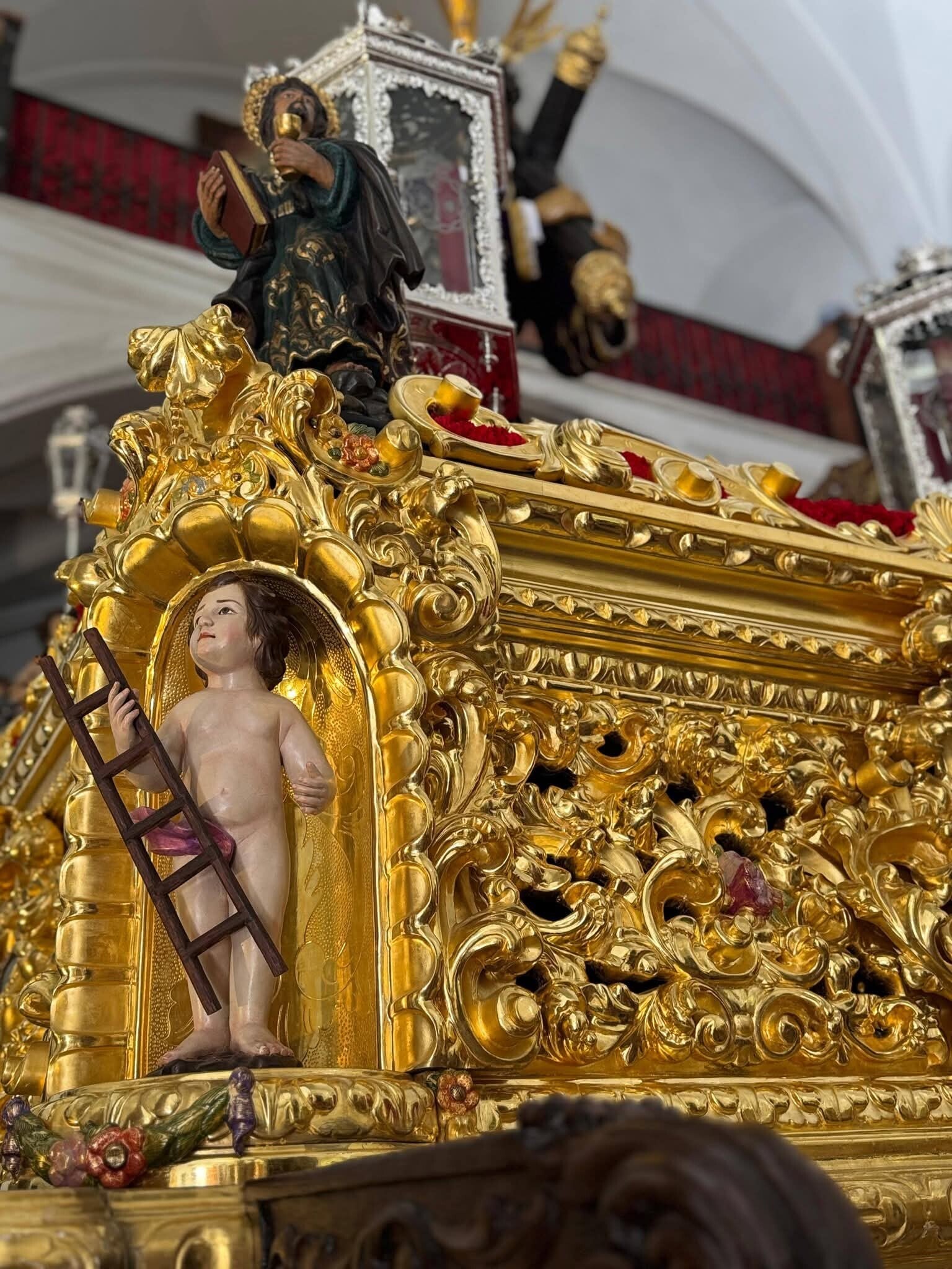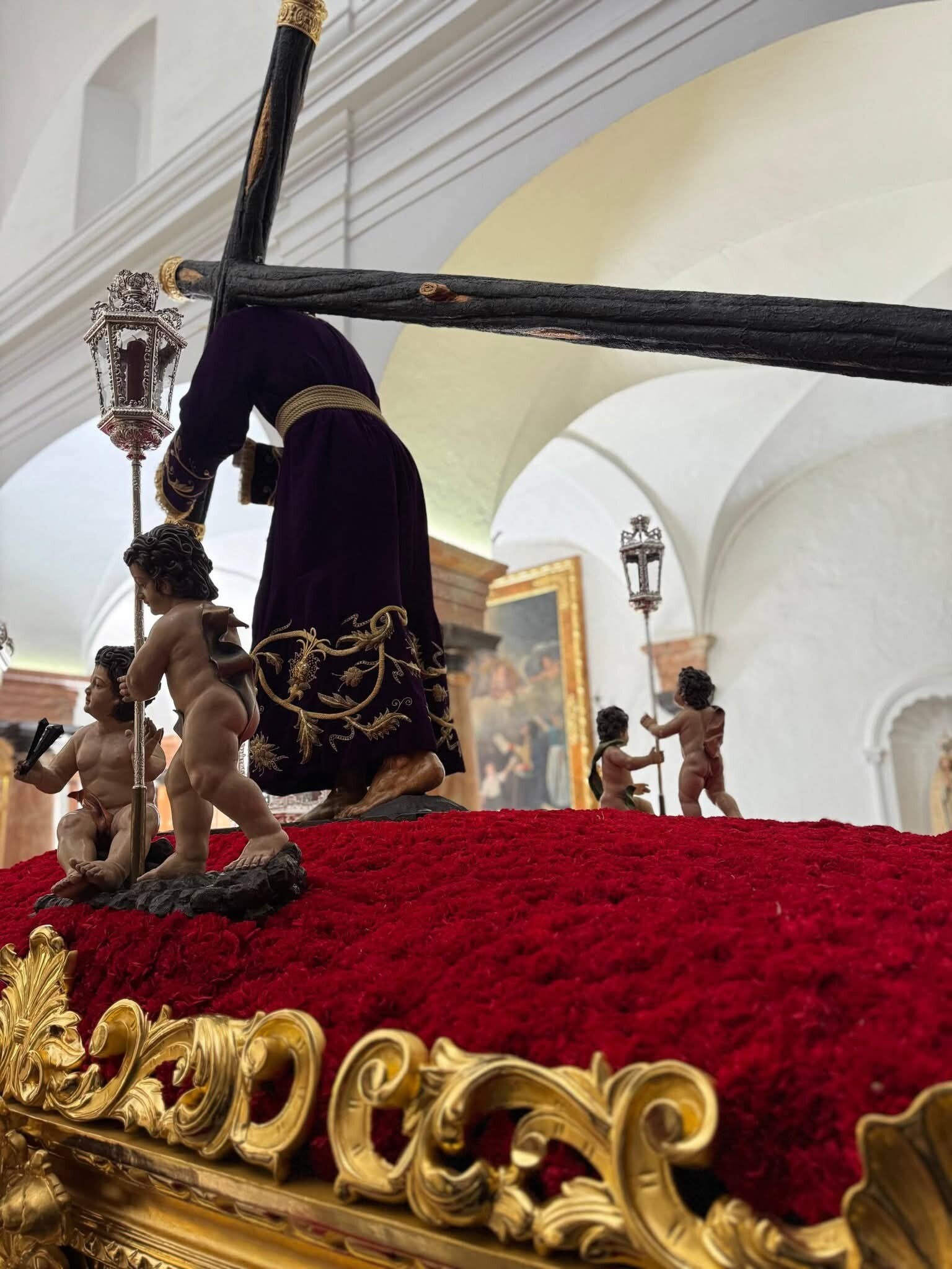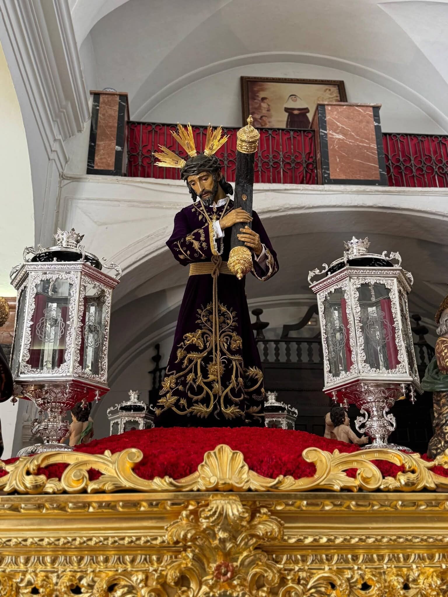 El paso procesional del Gran Poder con monte de clavel rojo y cera también roja. El Señor viste túnica bordada en oro (principios s. XX).