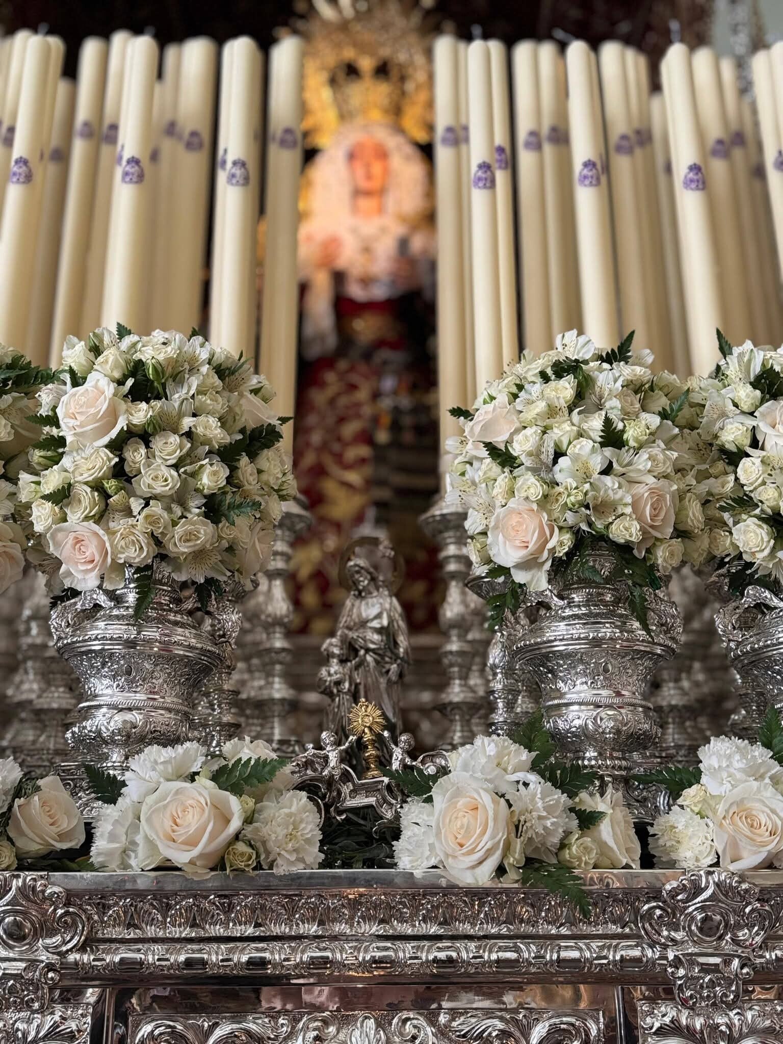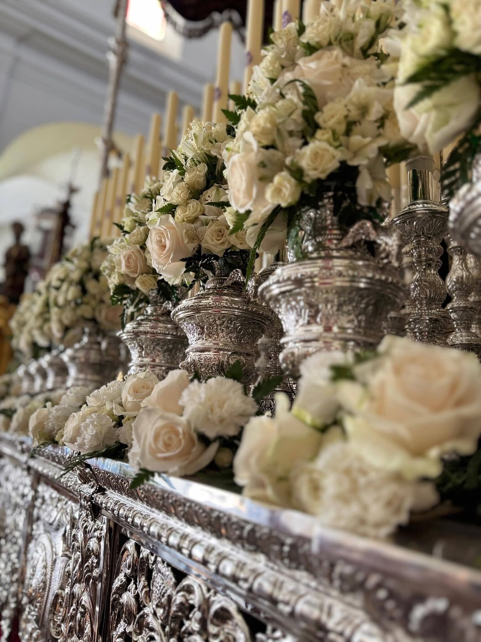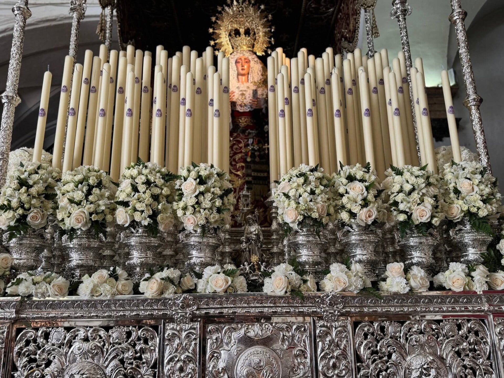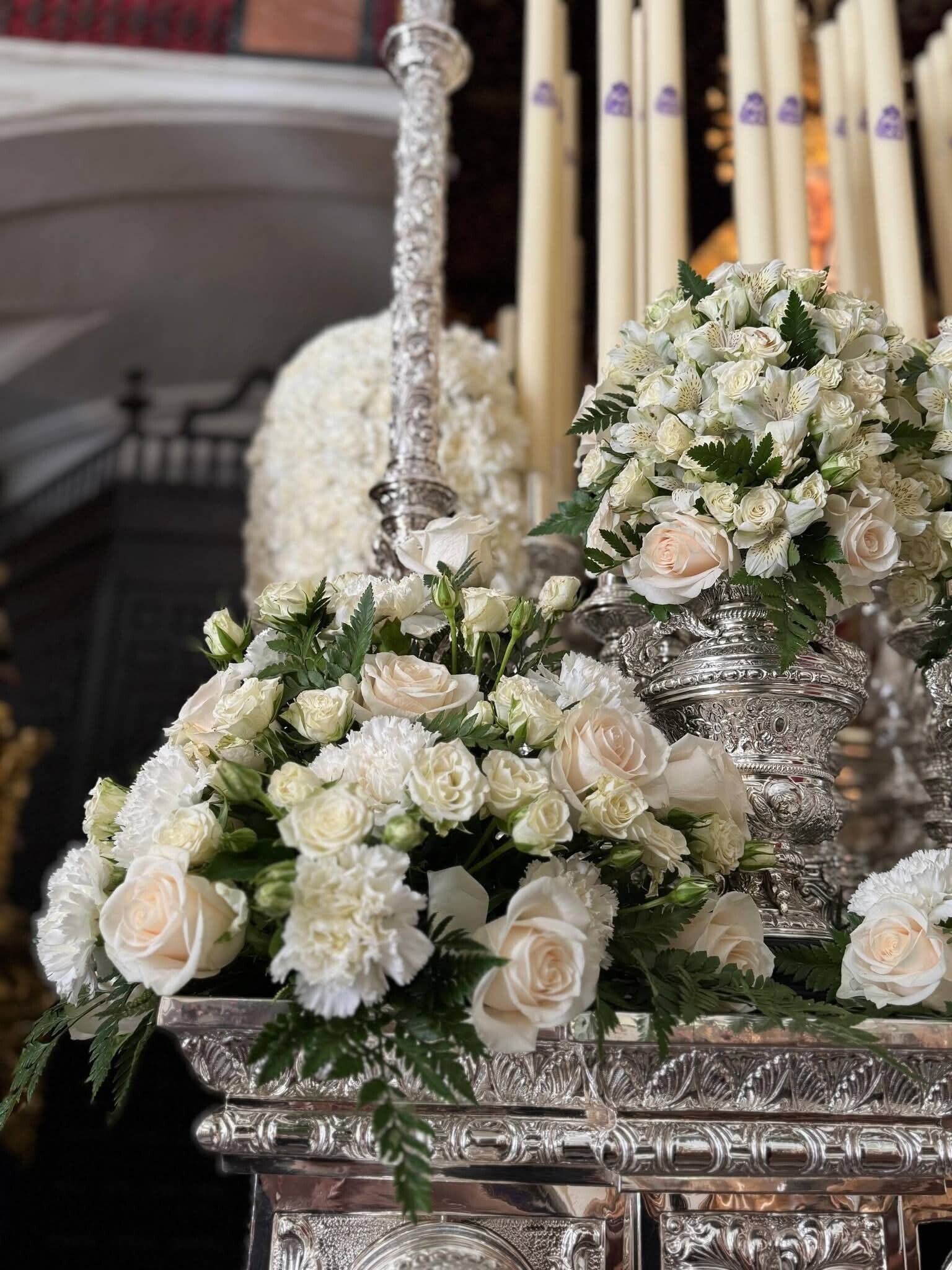 El paso procesional de María Santísima de los Dolores, lo exorna un conjunto de flor blanca, compuesto por: Rosas Englanteria y Gallica, Rosas Chinensis, Freesias, Alstromerias Princesa y Clavel. Así mismo la ornamentación de cera, blanca y escudo de la hermandad en morado.