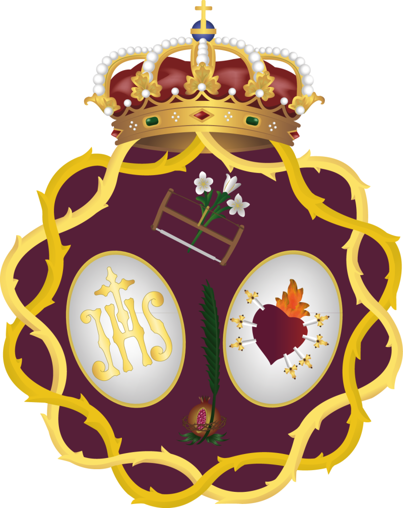 El Escudo de la Hermandad está formado por una corona de espinas, en oro, que trae en campo de púrpura dos escudos ovales acolados con fileras de oro y campo de argén. En el siniestro figura el anagrama JHS en oro, haciendo mención al Salvador, y en el diestro un corazón de gules flameante en oro por siete puñales de argén y oro, tres a la siniestra y cuatro a la diestra, representando a nuestra Madre, la Santísima Virgen de los Dolores.